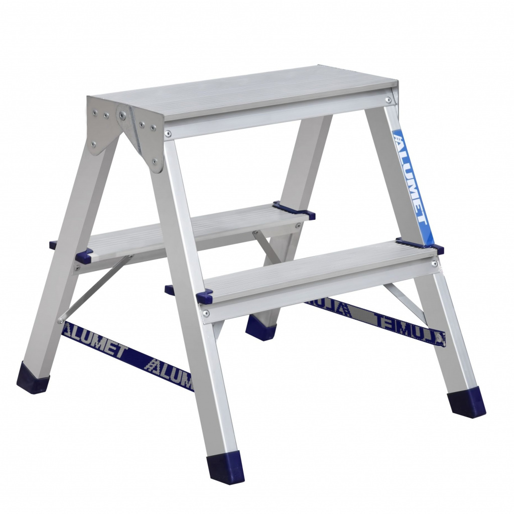 Стремянка алюминиевая двухсторонняя серии АD компании АЛЮМЕТ представляет собой свободностоящую переносную лестницу, сужающуюся к верху, имеющую две стороны подъема и раскладывающуюся для выполнения определённой задачи. Верхняя рабочая площадка образуется только в рабочем положении из двух верхних ступенек двух составных частей стремянки. Стремянка фиксируется двумя страховочными ремнями.
