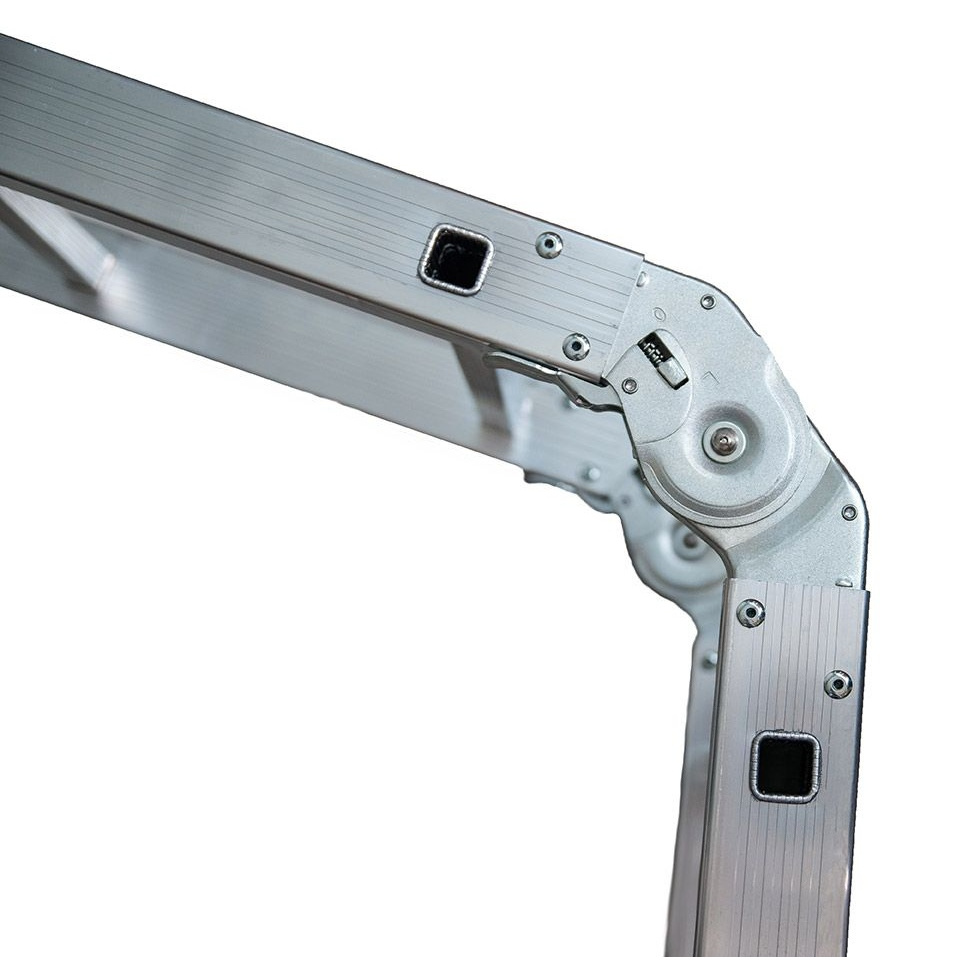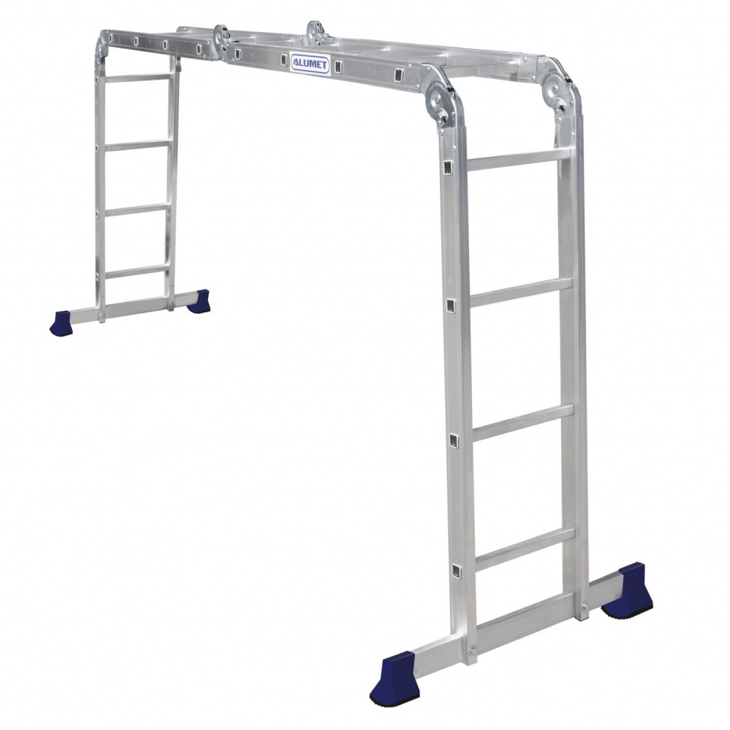 Лестница-трансформер компании АЛЮМЕТ состоит из четырех секций, соединенных между собой стальными лестничными шарнирами с углами фиксации 35, 105 и 180 °. Поэтому такая лестница может принимать различные формы, такие как на рисунке.