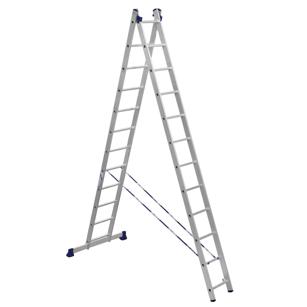 Лестница двухсекционная компании АЛЮМЕТ может использоваться как раздвижная приставная лестница и как свободностоящая двухсторонняя стремянка. Прочность конструкции в приставном виде обеспечивается необходимым перехлестом секций, что делает ее конструктивно сложнее, тяжелее и поэтому дороже по сравнению с односекционной лестницей. От «расползания» лестницу в конфигурации «двухсторонняя стремянка» удерживают страховочные ремни. Они же обеспечивают требуемый перехлест в конфигурации «приставная лестница». Конструкция неразборна, поэтому отдельно пользоваться каждым из двух элементов лестницы невозможно.