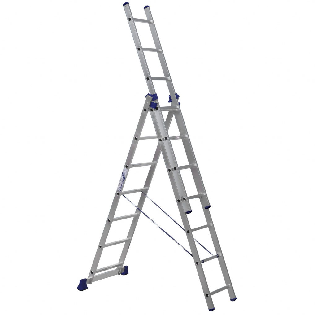 Универсальность данной алюминиевой трехсекционной лестницы компании АЛЮМЕТ заключается в том, что она может использоваться как раздвижная приставная лестница из трех частей и как свободностоящая стремянка (перевернутая русская буква «У»).