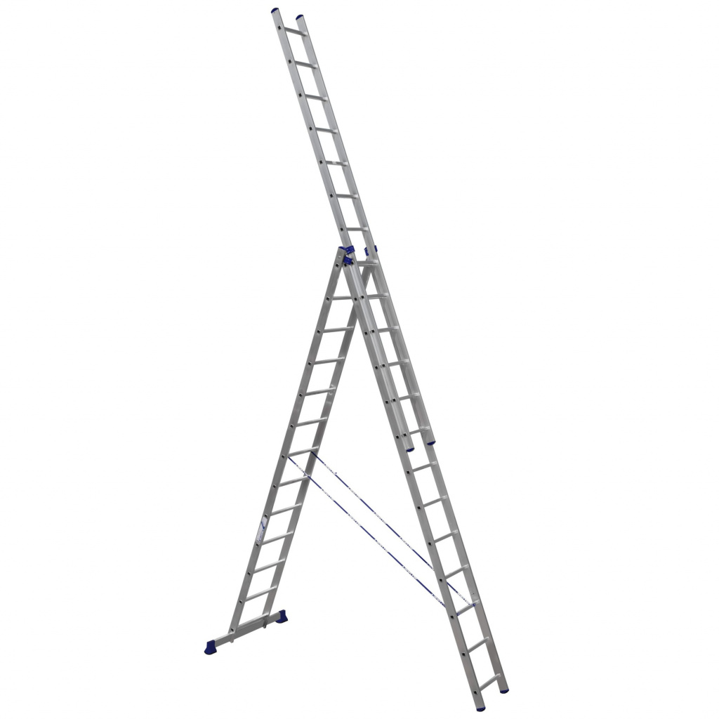 Универсальность данной алюминиевой трехсекционной лестницы компании АЛЮМЕТ заключается в том, что она может использоваться как раздвижная приставная лестница из трех частей и как свободностоящая стремянка (перевернутая русская буква «У»).