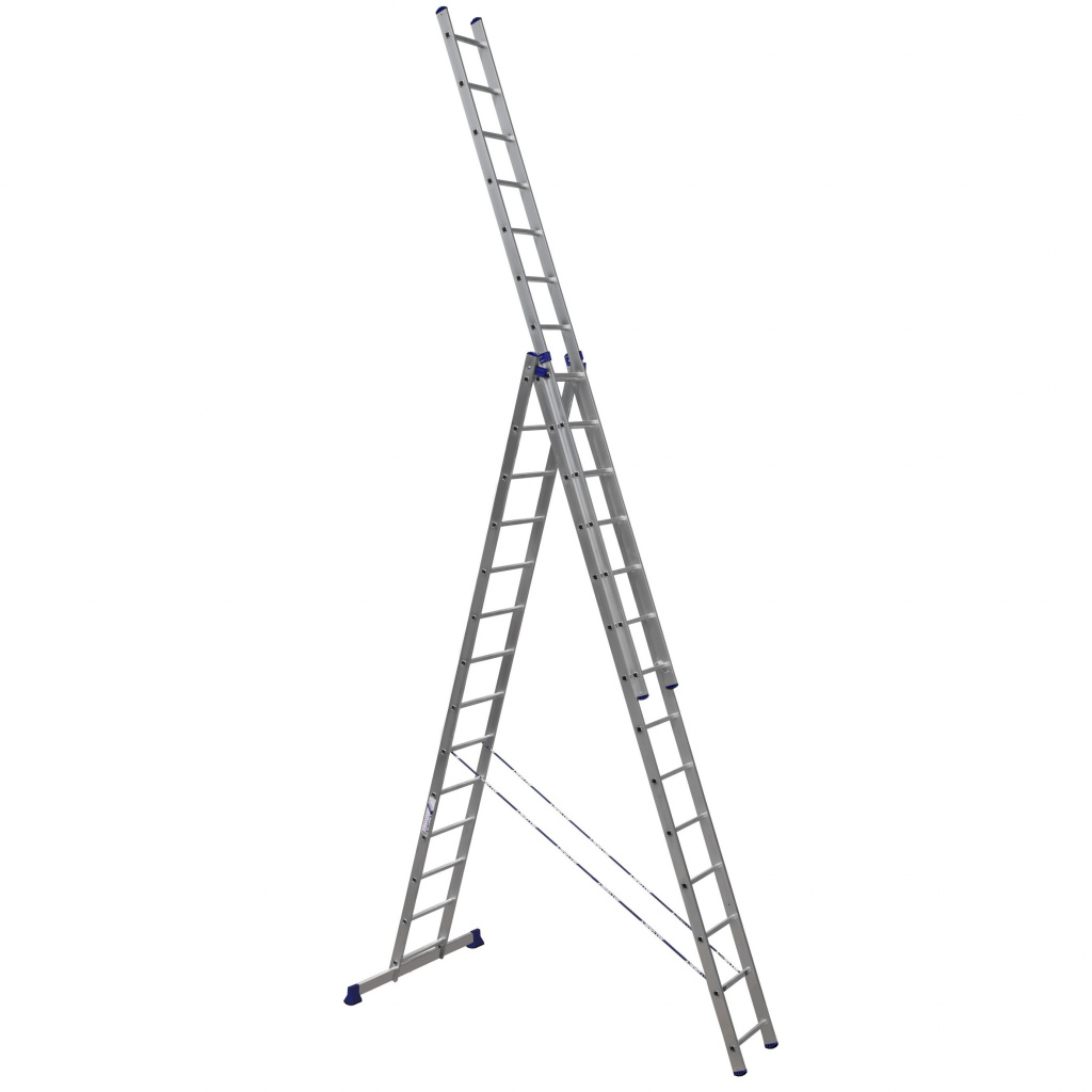 Универсальность данной алюминиевой трехсекционной лестницы компании АЛЮМЕТ заключается в том, что она может использоваться как раздвижная приставная лестница из трех частей и как свободностоящая стремянка (перевернутая русская буква «У»).