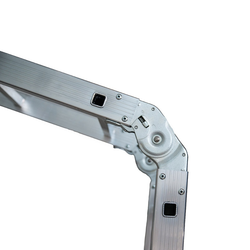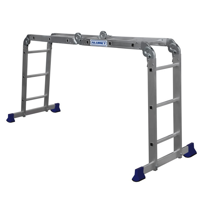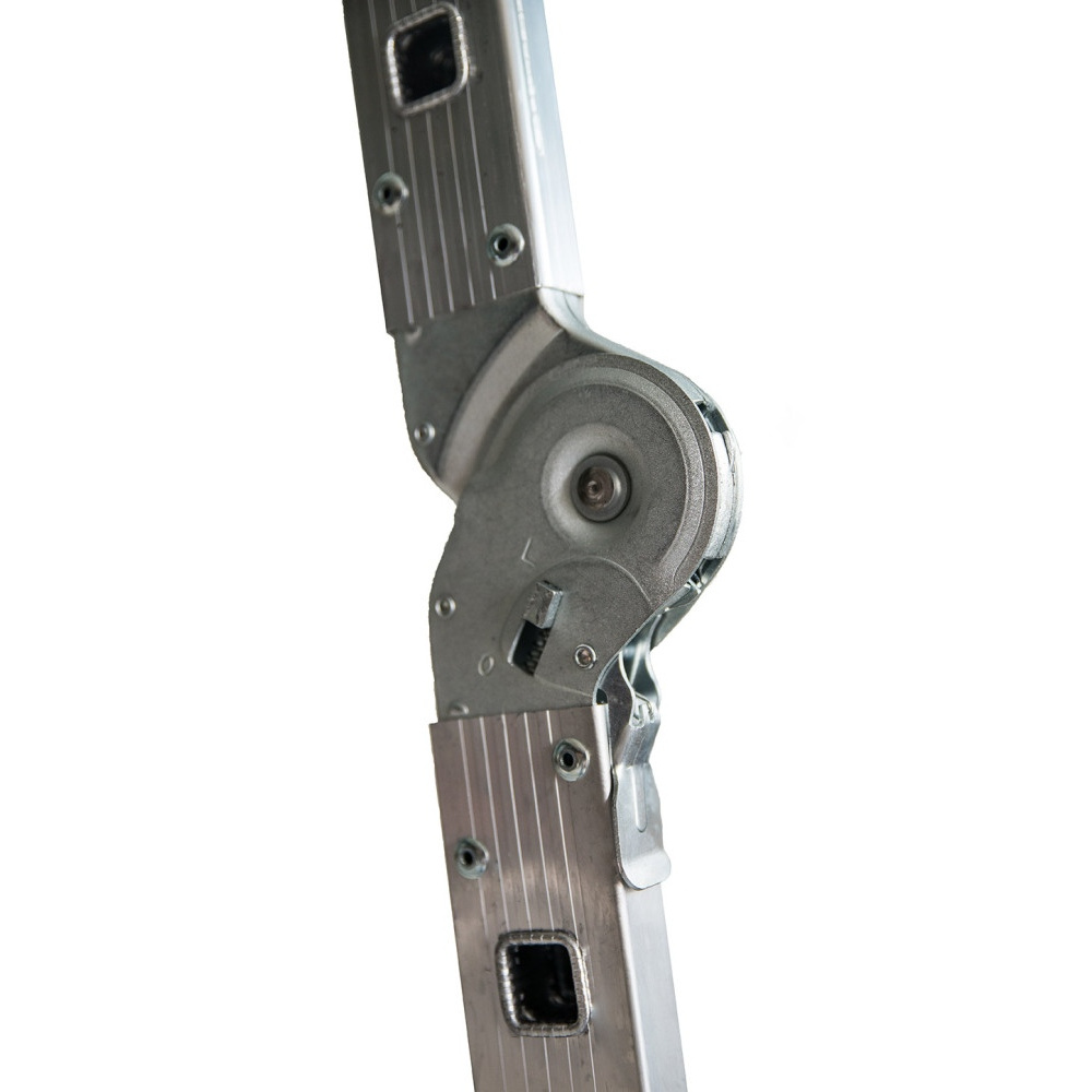 Лестница-трансформер компании АЛЮМЕТ состоит из четырех секций, соединенных между собой стальными лестничными шарнирами с углами фиксации 35, 105 и 180 °. Поэтому такая лестница может принимать различные формы, такие как на рисунке.