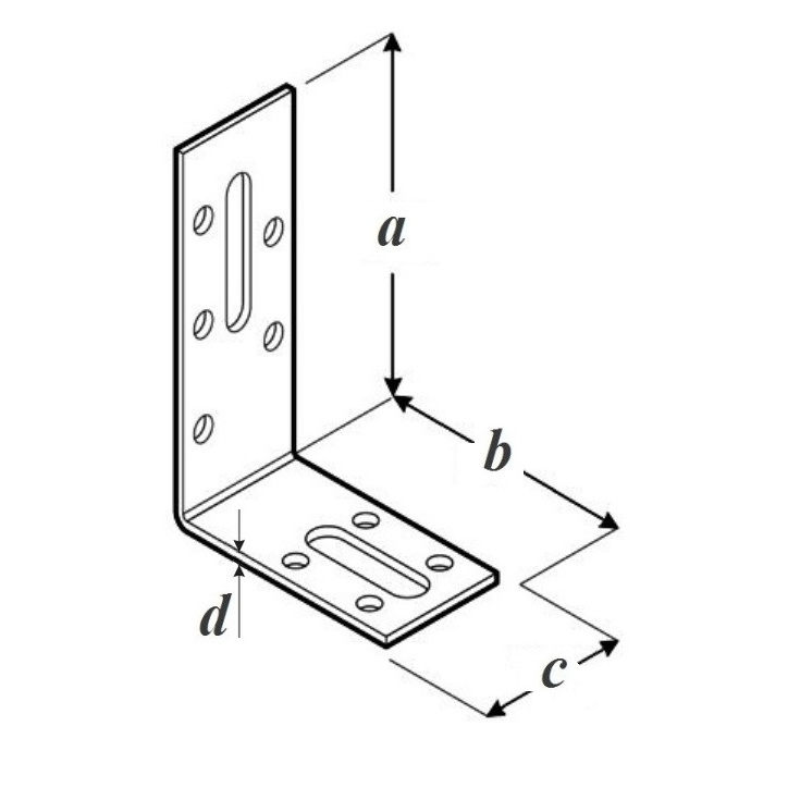 Регулируемый монтажный уголок предназначен для установки окон и перегородок из гипсокартона; продолговатые отверстия, кроме регулирующей, выполняют также компенсационную функцию, кроме того, такие отверстия можно использовать для предварительного монтажа, а окончательный выполнить с использованием круглых отверстий; позволяет скорректировать взаимное положение соединяемых элементов еще до забивания гвоздей, что может пригодиться при монтаже сложных конструкций или требующих точной сборки; благодаря тому, что соединяемые элементы могут несколько смещаться относительно друг друга, в креплении не возникают нагрузки, связанные с деформациями или изменением влажности дерева.
