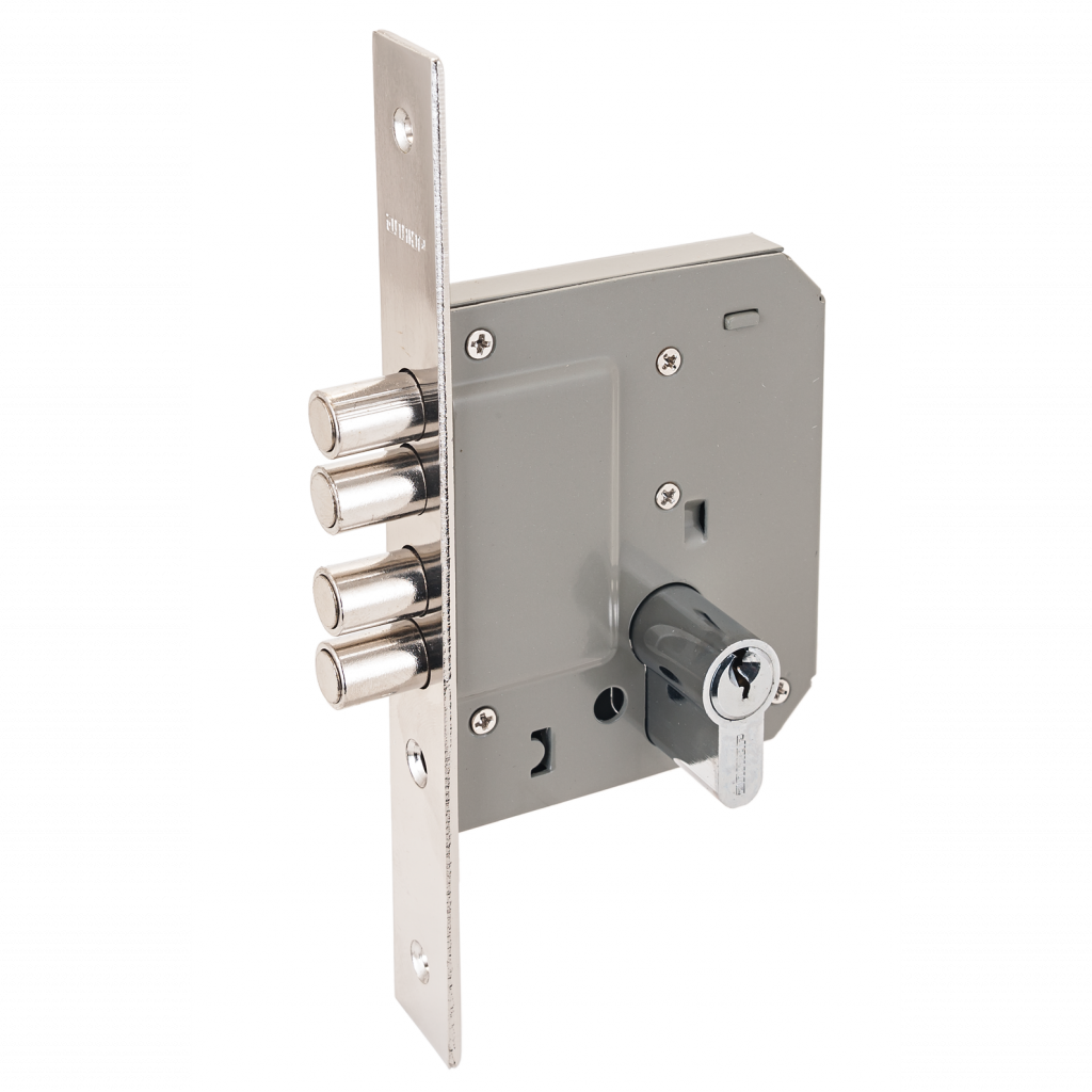 Корпус - стальной покрыт серой эмалью. Засов из четырех стальных цилиндрических ригелей. Вылет засова 28,5 мм Удаление ключевого отверстия 50 мм