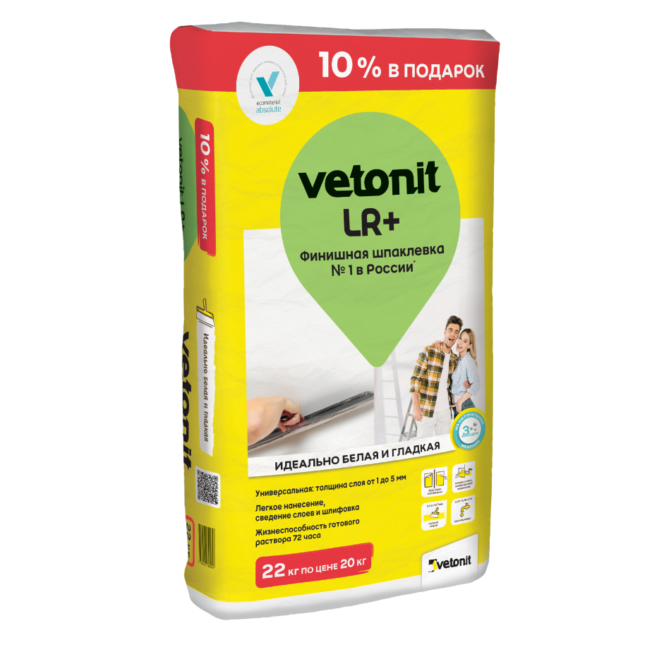 Vetonit LR+ - полимерная финишная шпаклевка предназначена для выравнивания поверхностей в сухих помещениях перед оклейкой обоями, покраской, отделкой декоративной штукатуркой.