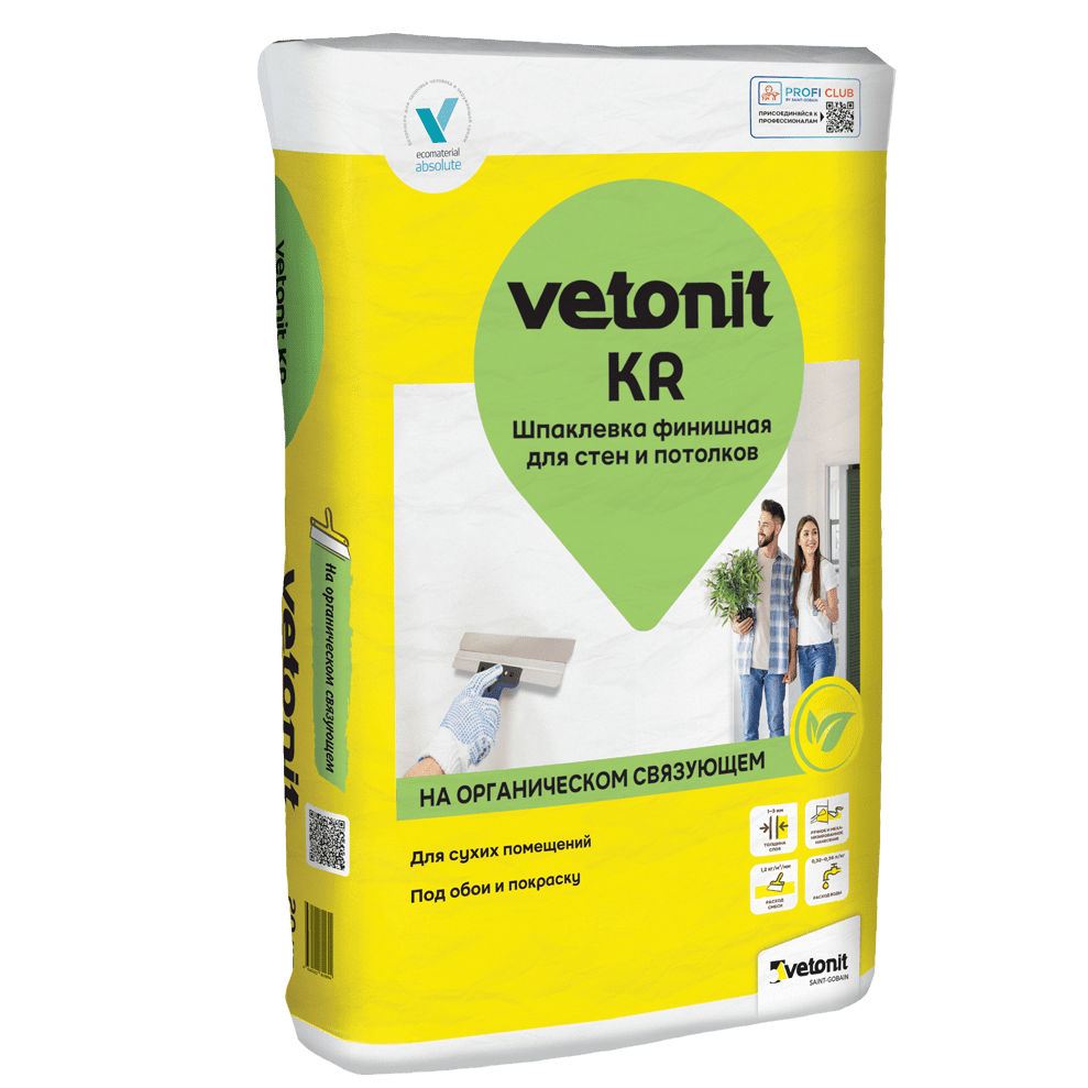 Vetonit KR - белая сухая финишная шпаклевка на органическом связующем (известняк), предназначена для финишного выравнивания стен и потолков в сухих помещениях перед оклейкой обоями и покраской.
