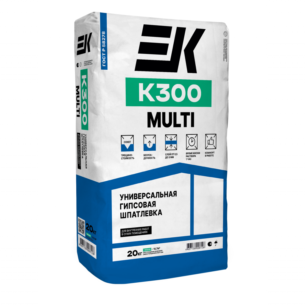 Шпатлевка гипсовая ЕК K300 улучшенная предназначена для тонкослойного выравнивания вертикальных и горизонтальных бетонных, пенобетонных, цементных, цементно-известковых, гипсовых и гипсокартонных поверхностей в сухих помещениях под окраску и оклейку обоями.