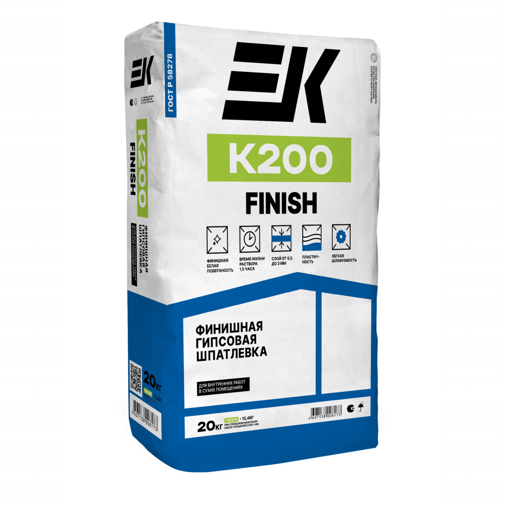 Гипсовая шпатлевка ЕК K200 улучшенная предназначена для финишного тонкослойного выравнивания вертикальных и горизонтальных бетонных, пенобетонных, цементных, цементно-известковых, гипсовых и гипсокартонных поверхностей в сухих помещениях под окраску и оклейку обоями.