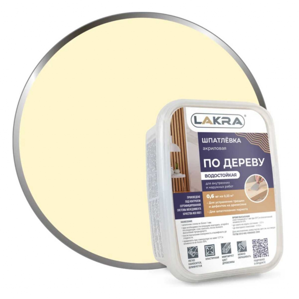 Шпатлевка по дереву ТМ ЛАКРА на основе водной акриловой дисперсии применяется для заполнения и выравнивания трещин, дефектов (сколы и т.п.), повреждений и неровностей на деревянных поверхностях (мебель, двери, пол, панельные стены, потолок). Рекомендуется для шпатлевания паркета.