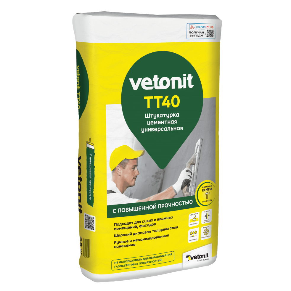 Штукатурка цементная универсальная Vetonit TT40 подходит для оштукатуривания фасадов, для предварительного выравнивания и ремонта стен и потолков в сухих, влажных и мокрых помещениях перед дальнейшим шпаклеванием, перед облицовкой керамической плиткой. Применяется по основаниям из бетона, кирпича, керамзитобетонных блоков, цементных штукатурок.