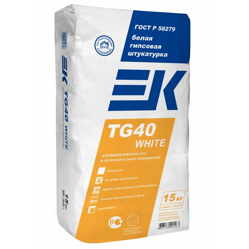 Штукатурка ЕК TG40 предназначена для выравнивания вертикальных и горизонтальных кирпичных, гипсовых, цементных и других минеральных оснований внутри сухих помещений.
