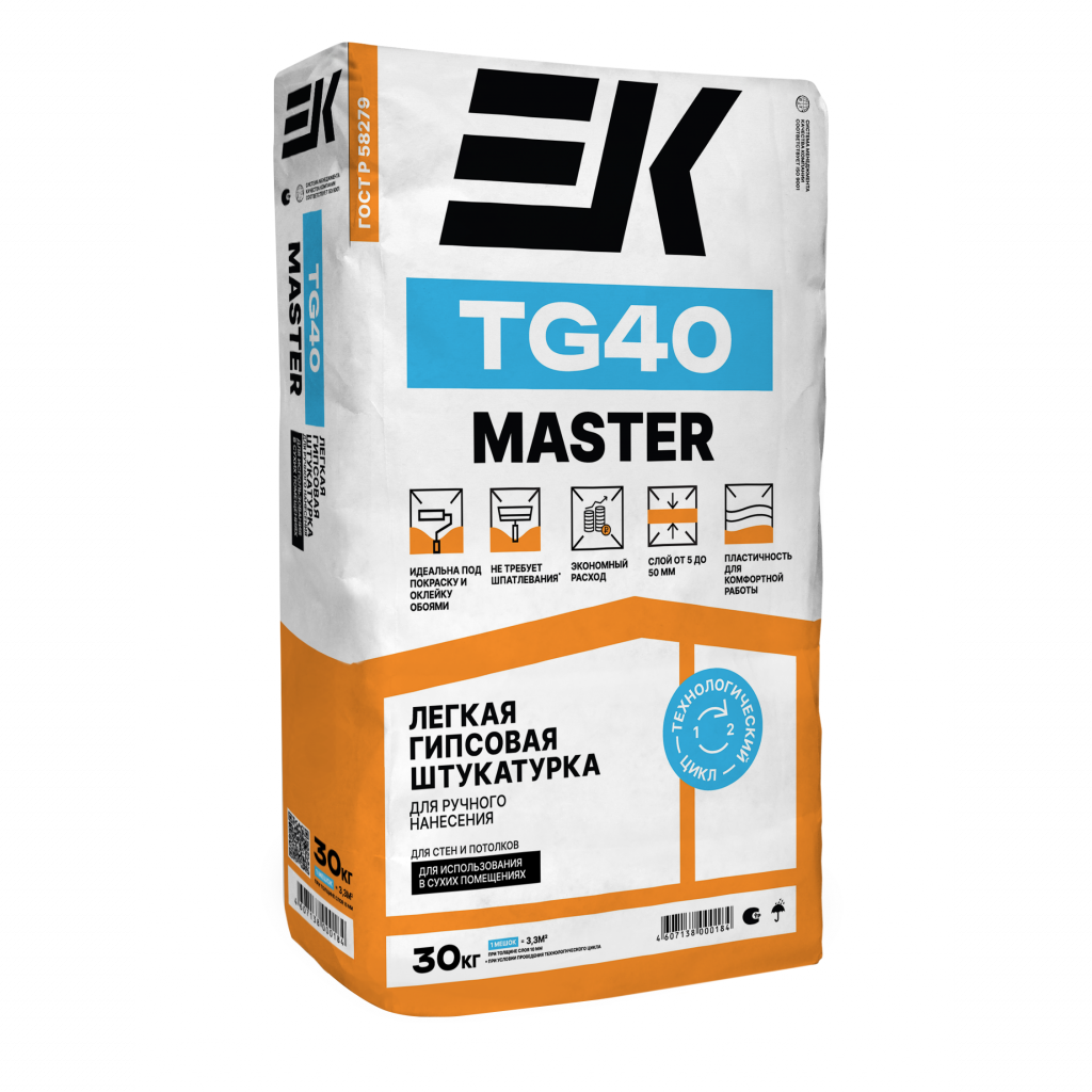 Штукатурка ЕК TG40 MASTER предназначена для выравнивания вертикальных и горизонтальных кирпичных, гипсовых, цементных и других минеральных оснований внутри сухих помещений.