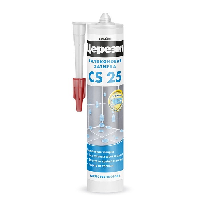 Затирка Церезит CS 25 - эластичная силиконовая затирка-герметик предназначена для герметизации угловых, деформационных и примыкающих к санитарно-техническому оборудованию (ваннам, раковинам и др.) швов плиточных облицовок в помещениях с повышенной влажностью: ванных комнатах, душевых, кухнях, туалетах и т.д. Обладает высокой адгезией к эмалированным поверхностям, стеклу, фарфору и фаянсу. Формула ТриоПротект обеспечивает длительную стойкость к грибку и плесени. Благодаря высокой стойкости к УФ-излучению и озону может применяться при наружных работах.