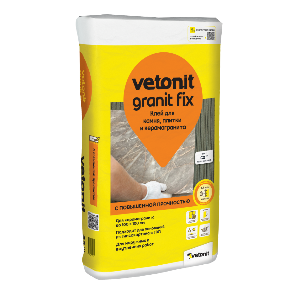 Клей Vetonit Granit Fix - класса С2 Т подходит для внутренних и наружных работ, для стен и пола, включая систему "Теплый пол". Рекомендованный формат керамогранита - до 100х100 см.