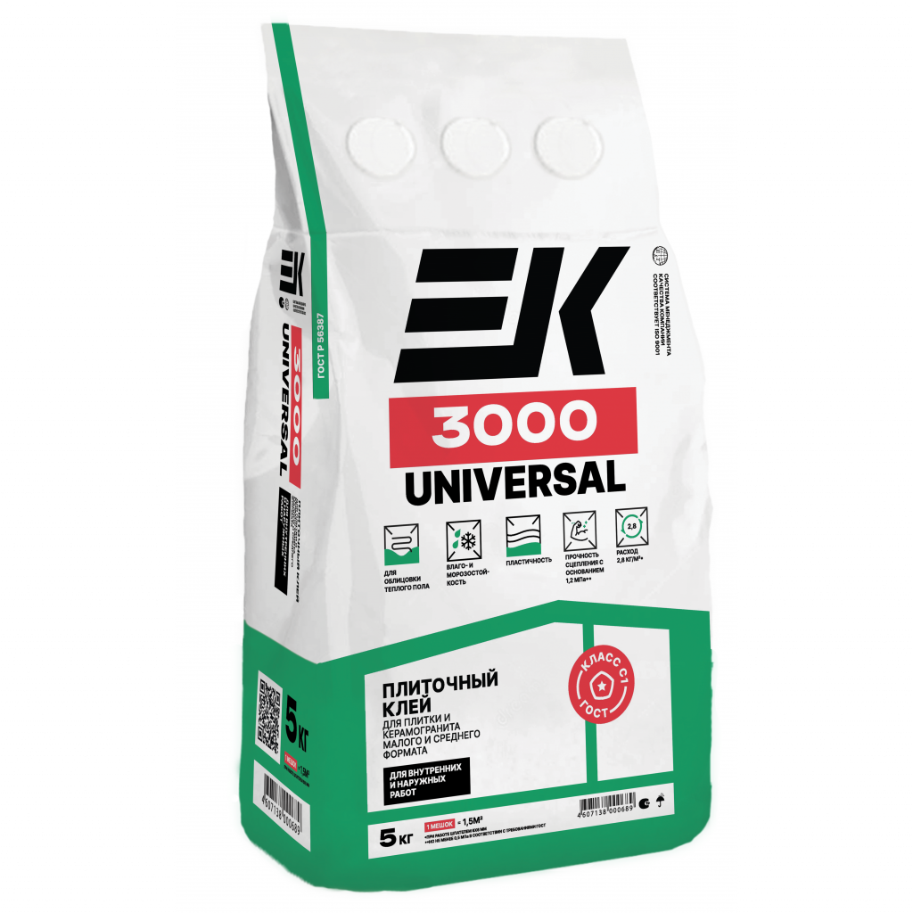 Плиточный клей для плитки и керамогранита малого и среднего формата ЕК 3000 UNIVERSAL, сухая строительная клеевая смесь С1, ГОСТ Р 56387, изготовленная на основе цементного вяжущего, минеральных наполнителей, фракционированного песка и модифицирующих добавок, улучшающих эксплуатационные свойства, для внутренних и наружных работ.