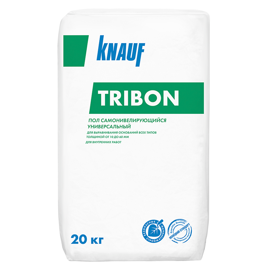 Универсальная сухая строительная смесь КНАУФ-Трибон на основе смешанного (комплексного) вяжущего (строительного гипса и портландцемента), специальных модифицирующих добавок и кварцевого песка в качестве заполнителя. Применяется внутри помещений с сухим и нормальным режимами влажности по несущим основаниям для создания самонивилирующихся выравнивающих стяжек толщиной 10-60 мм под последующие финишные покрытия при ремонте и новом строительстве по бетонным и деревянным основаниям.