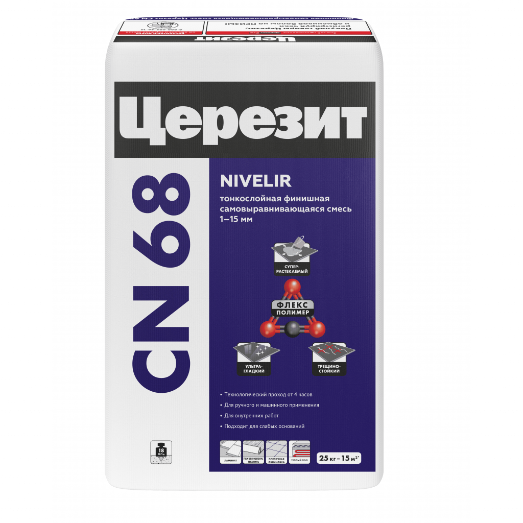 Самовыравнивающаяся смесь Церезит CN 68 предназначена для выравнивания бетонных, цементно-песчаных, ангидритных и гипсовых горизонтальных оснований под укладку керамических плиток, линолеума, ковролина, ламината и других напольных покрытий, кроме паркета, в сухих помещениях с низкими механическими нагрузками (жилых, бытовых, административных, общественных и т.п.) толщиной слоя 1-15 мм