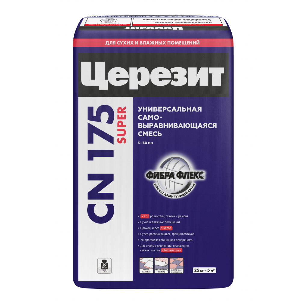 Универсальная самовыравнивающаяся смесь для пола Церезит СН 175 Супер содержит в своем составе армированное микроволокно Fibre Force, разработана как средство предварительного выравнивания основания перед выполнением работ по установке напольных покрытий, а также подходит для выполнения ремонтных работ – ликвидация разломов, углублений, и формирования стяжек. Вязкая консистенция позволяет избежать усадки и создать слой толщиной от 3 до 60 мм.