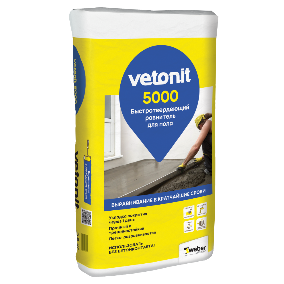 Vetonit 5000 - быстротвердеющий ровнитель для пола под дальнейшее нанесение наливных полов или укладку напольного покрытия. Толщина слоя 5-50 мм с возможностью локального ремонта до 80 мм.