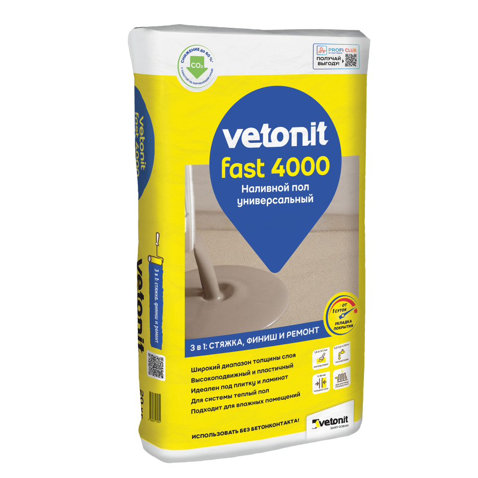 Vetonit Fast 4000 - самовыравнивающийся универсальный быстротвердеющий наливной пол. 3 в 1: стяжка, финиш + ремонт благодаря широкому диапазону толщин (3-80 мм). Применяется как в сухих, так и во влажных помещениях под укладку ламината, плитки, линолеума, ковролина и т.п. Применим для системы «теплый пол» с электроподогревом.