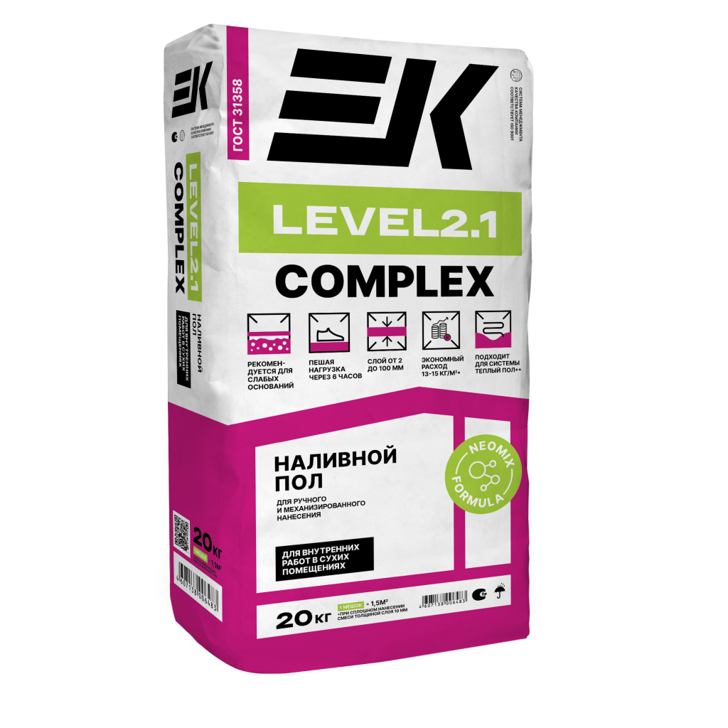 Наливной пол ЕК LEVEL 2.1 COMPLEX, сухая самовыравнивающаяся смесь Рк6, Btb2.4, B10, ГОСТ 31358, изготовленная на основе комплексного вяжущего, минеральных наполнителей, фракционированного песка и модифицирующих добавок, улучшающих эксплуатационные свойства, для внутренних работ в сухих помещениях.