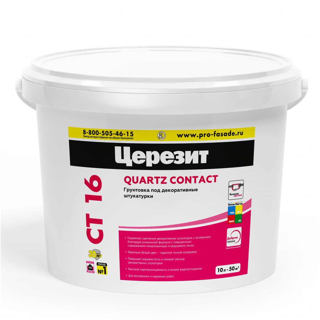 Церезит CT 16 Quartz Contact - водно-дисперсионная грунтовка для подготовки оснований под тонкослойные декоративные штукатурки и фасадные краски на стены при внутренних и наружных работах. Обладает высокой проникающей способностью, что позволяет улучшить адгезию поверхности, уменьшить его впитывающую способность и устранить различия в впитывающей способности поверхности, что является гарантией равномерного нанесения последующего слоя отделочного материала.