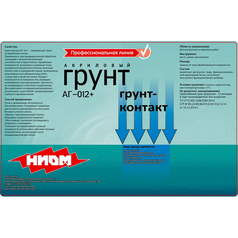 Грунт бетон-контакт (АГ-012) ТМ НИОМ - специальный грунт на акриловой основе для внутренних и наружных работ. Применяется для предварительной обработки оснований с низкой впитывающей способностью (старая плитка, окрашенные поверхности, мозаичные и каменные полы, поверхности монолитного бетона, бетонных блоков, плит и перекрытий) перед проведением штукатурных или облицовочных работ, а также при устройстве полов.
