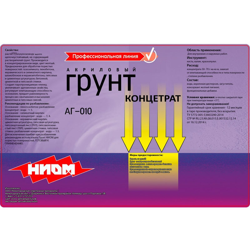 КОНЦЕНТРАТ Грунта НИОМ АГ-010 - основа для получения рабочего состава - качественного проникающего грунта при обязательном разведении водой. Полученный грунт применяется на всех минеральных основаниях; бетон, гипс, гипсокартон, силикатный кирпич, кирпич керамический, газосиликат, пенобетон, а также, древесина, ДВП, ДСП, МДФ, OSB, ГВЛ, ГКЛ, СМЛ перед нанесением штукатурок, шпатлевок, красок любых типов, перед наклеиванием обоев, керамической плитки, перед настилом напольных покрытий и перед заливом самовыравнивающихся полов и т.п. при проведении наружных и внутренних работ.