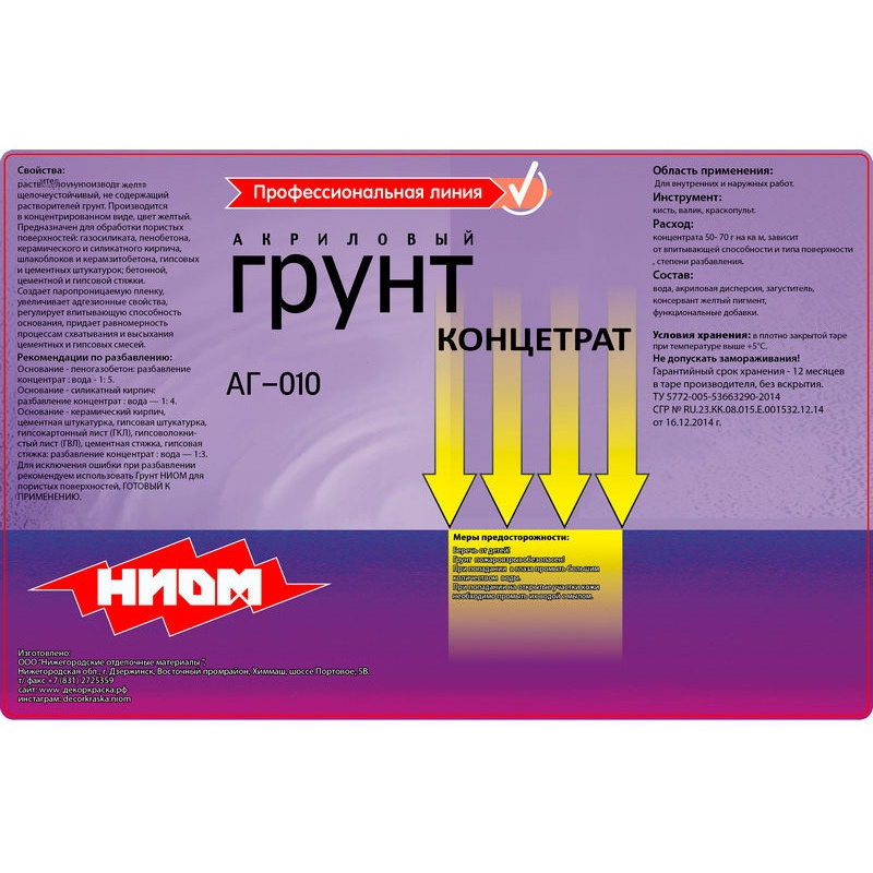 КОНЦЕНТРАТ Грунта НИОМ АГ-010 - основа для получения рабочего состава - качественного проникающего грунта при обязательном разведении водой. Полученный грунт применяется на всех минеральных основаниях; бетон, гипс, гипсокартон, силикатный кирпич, кирпич керамический, газосиликат, пенобетон, а также, древесина, ДВП, ДСП, МДФ, OSB, ГВЛ, ГКЛ, СМЛ перед нанесением штукатурок, шпатлевок, красок любых типов, перед наклеиванием обоев, керамической плитки, перед настилом напольных покрытий и перед заливом самовыравнивающихся полов и т.п. при проведении наружных и внутренних работ.