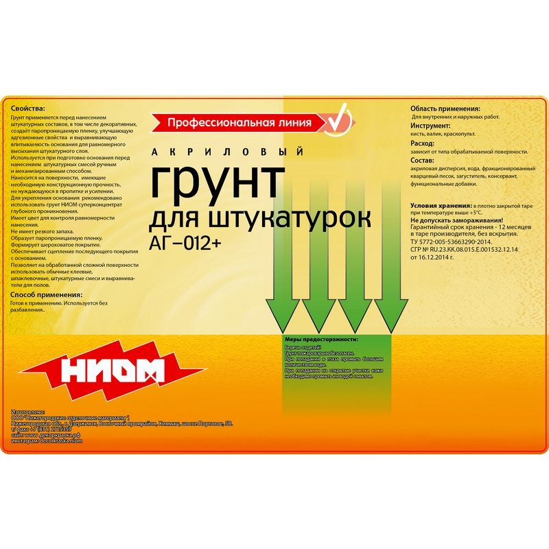 Грунт акриловый для штукатурок АГ-012+ ТМ НИОМ применяется для подготовки различных поверхностей перед нанесением штукатурного слоя, создаёт паропроницаемую пленку, улучшающую адгезионные свойства, выравнивает впитывающую способность поверхности основания, для равномерного высыхания штукатурного слоя. Используется при подготовке основания перед нанесением штукатурных смесей ручным и механизированным способом.