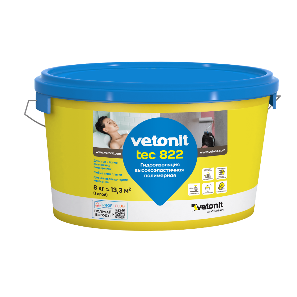 Гидроизоляционная полимерная мастика Vetonit Tec 822 готовая к применению. Высокоэластичная бесшовная гидроизоляция под плитку для помещений с повышенной влажностью - ванных комнат, душевых, санузлов, кухонь, балконов и лоджий. Для защиты от повреждения водой чувствительных к влаге материалов: гипсокартонных листов, гипсоволокнистых листов, гипсовых штукатурок и полов.