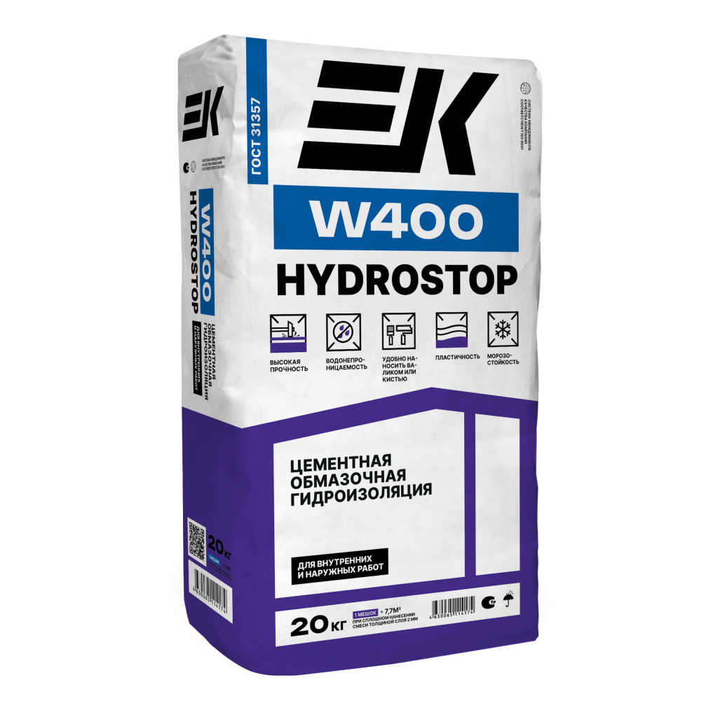 Гидроизоляция ЕК W400 HYDROSTOP, сухая дисперсная гидроизоляционная смесь В7.5, W8, F75, ГОСТ 31357, изготовленная на основе цементного вяжущего, минеральных наполнителей, фракционированного песка, гидрофобизаторов и модифицирующих добавок, улучшающих эксплуатационные свойства.