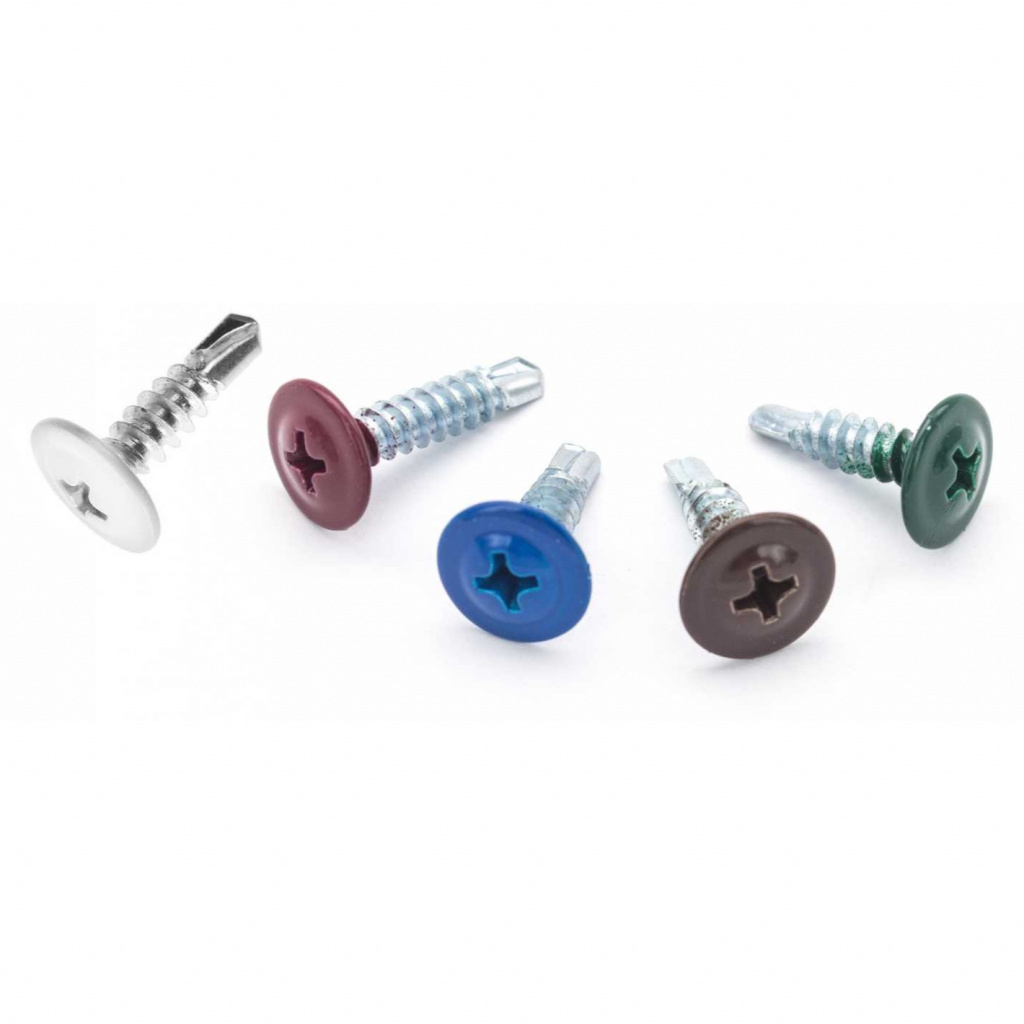 Саморез с полусферической головкой с прессшайбой, наконечником сверло, окрашенный в цвет RAL применяется для крепления листов металла до 2 мм при монтаже кровли.