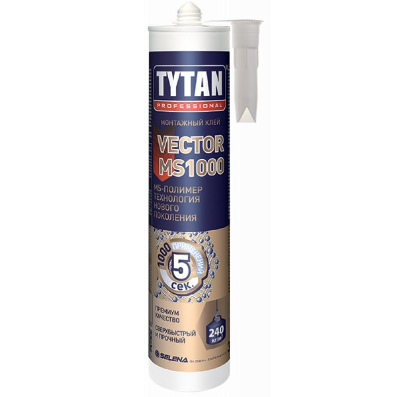 Клей монтажный VECTOR MS-1000 Tytan Professional на основе MS-полимера склеивает ПВХ, стекло, металл, керамику, камень, дерево, пластик. Экологически безопасен, быстро схватывается и образует водонепроницаемый шов.