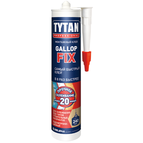 Клей GALLOP FIX торговой марки Tytan Professional - гибридный монтажный клей быстрого схватывания для склеивания широкого спектра отделочных материалов к типичным поверхностям, таким как бетон, штукатурка, древесно-стружечная плита, дерево, кирпич, стекло.