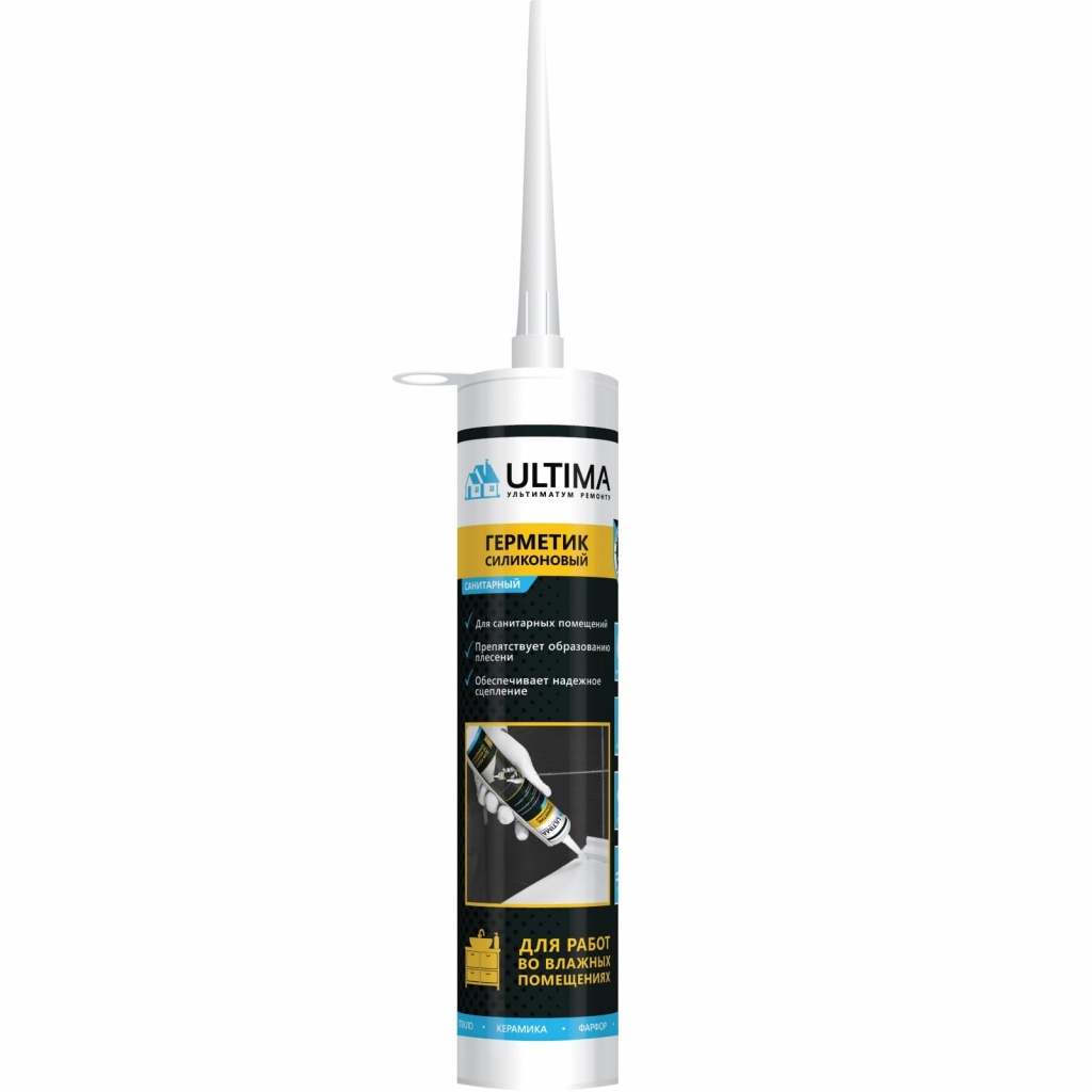 Силиконовый санитарный герметик Ultima S предназначен для заполнения подвижных швов и монтажа сантехнического оборудования в помещениях с повышенной влажностью (бассейны, ванные комнаты, душевые кабины, кухни). Состав обладает хорошей адгезией к гладким, окрашенным и лакированным поверхностям (стекло, керамика, металл). Фунгицидные добавки препятствуют появлению плесени и грибка. Продукт после высыхания образует эластичное водостойкое клеевое соединение.