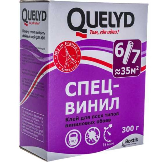 Клей Спец-Винил ТМ Quelyd - это сухой обойный клей на основе натурального картофельного крахмала с усиленной формулой для всех виниловых обоев на бумажной основе, для тяжелых, структурных, вспененных рельефных обоев, для обоев с шелкографией, а также велюровых, текстильных и специальных обоев.