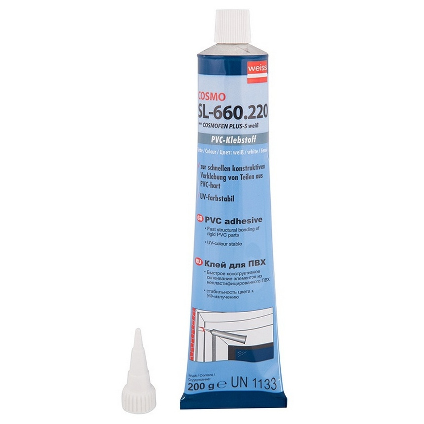 Однокомпонентный диффузионный клей Cosmo SL-660.220 / Cosmofen Plus-S предназначен для быстрого конструкционного склеивания деталей из жёсткого ПВХ при оконном производстве, сантехнических работах, в рекламном и выставочном производстве. Полутвердый клеевой шов, хорошая способность выдерживать температурные нагрузки, тиксотропный, не капает, имеет хорошую устойчивость против УФ-нагрузки. Цвет в отвержденном состоянии: белый.