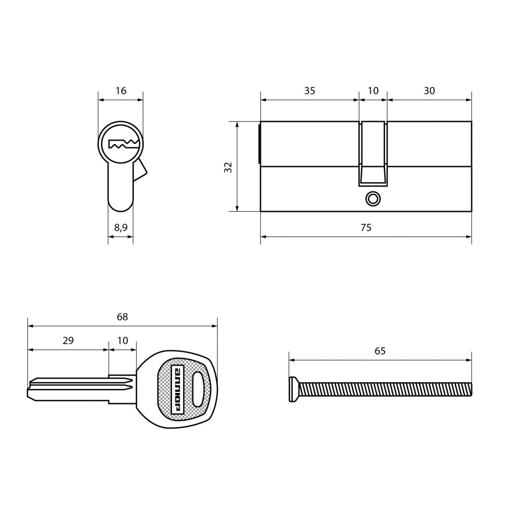 Материал корпуса и ключей - латунь. Ключ-ключ. Длина механизма - 75 мм (30х10х35).