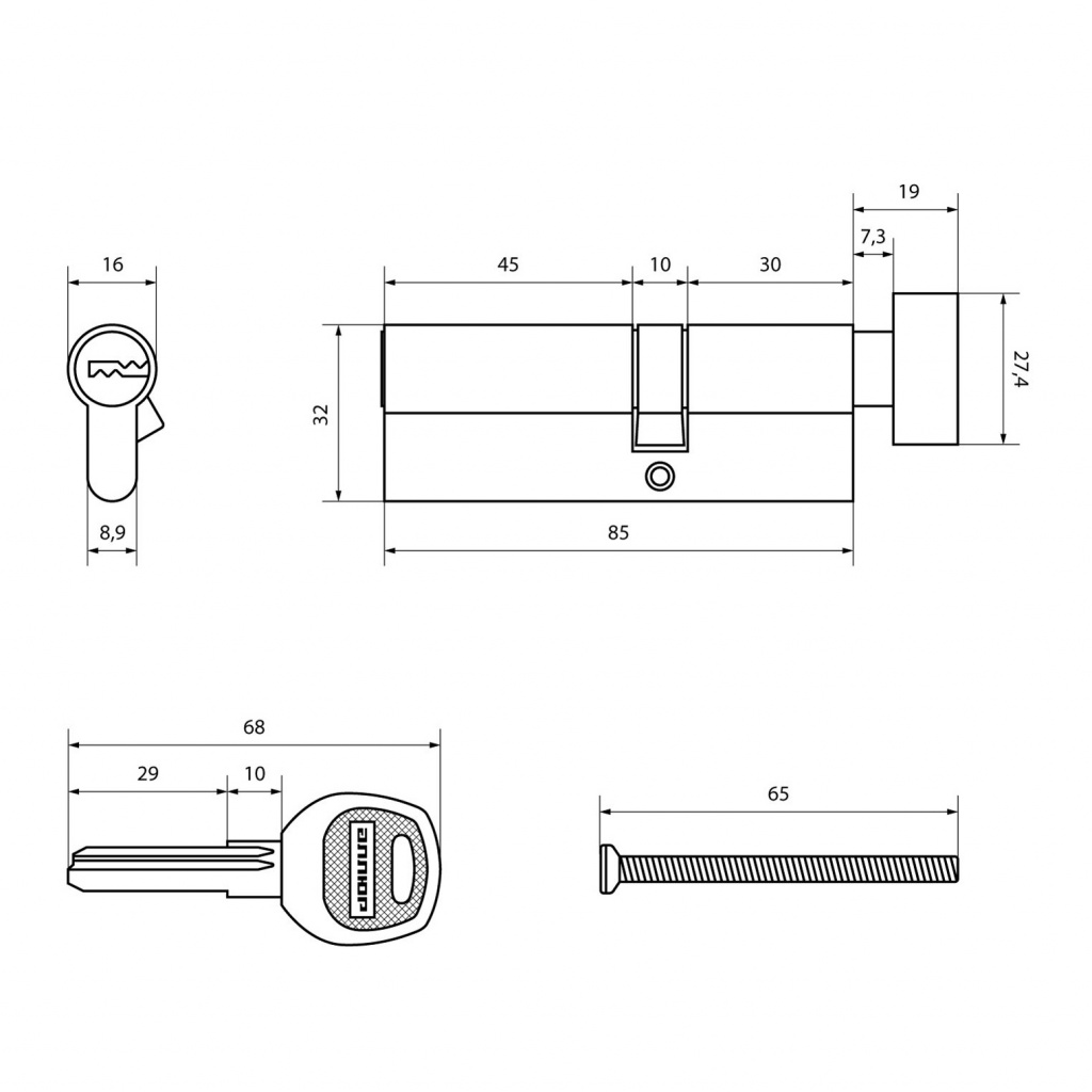 Материал корпуса и ключей - латунь. Ключ-вертушка. Длина механизма - 85 мм (30х10х45).