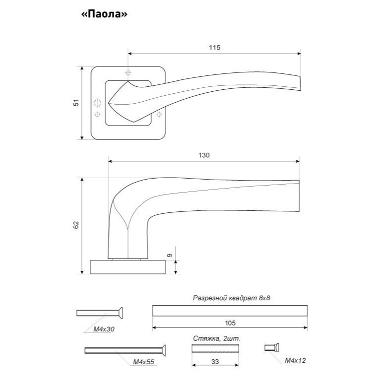 Ручка на квадратной накладке для дверей толщиной 34-45 мм
