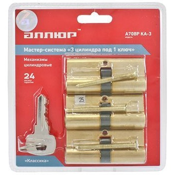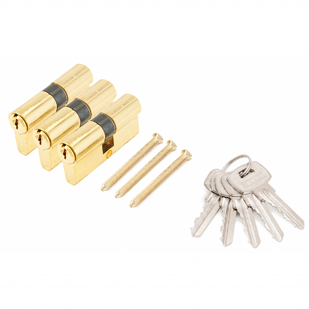 Комплект из цилиндровых механизмов одинаковой секретности для врезных замков. Механизм защищен стержнем от высверливания. Выступающий на 30 градусов из плоскости механизма кулачок защищает цилиндр от выбивания из двери. Ключ-ключ.