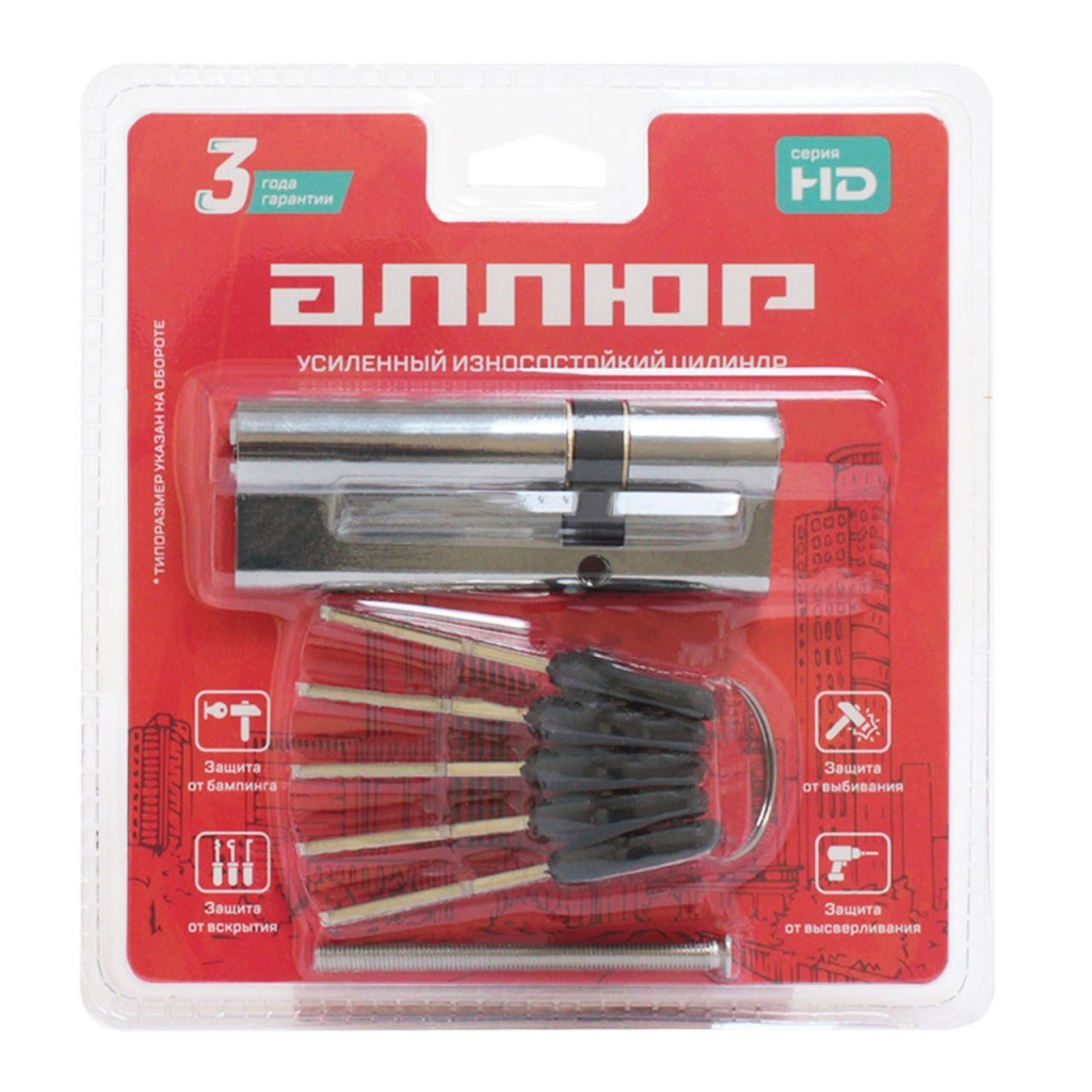 Механизм защищен от высверливания, вскрытия бампингом и отмычками. Выступающий на 30 градусов из плоскости механизма кулачок защищает цилиндр от выбивания из двери.
