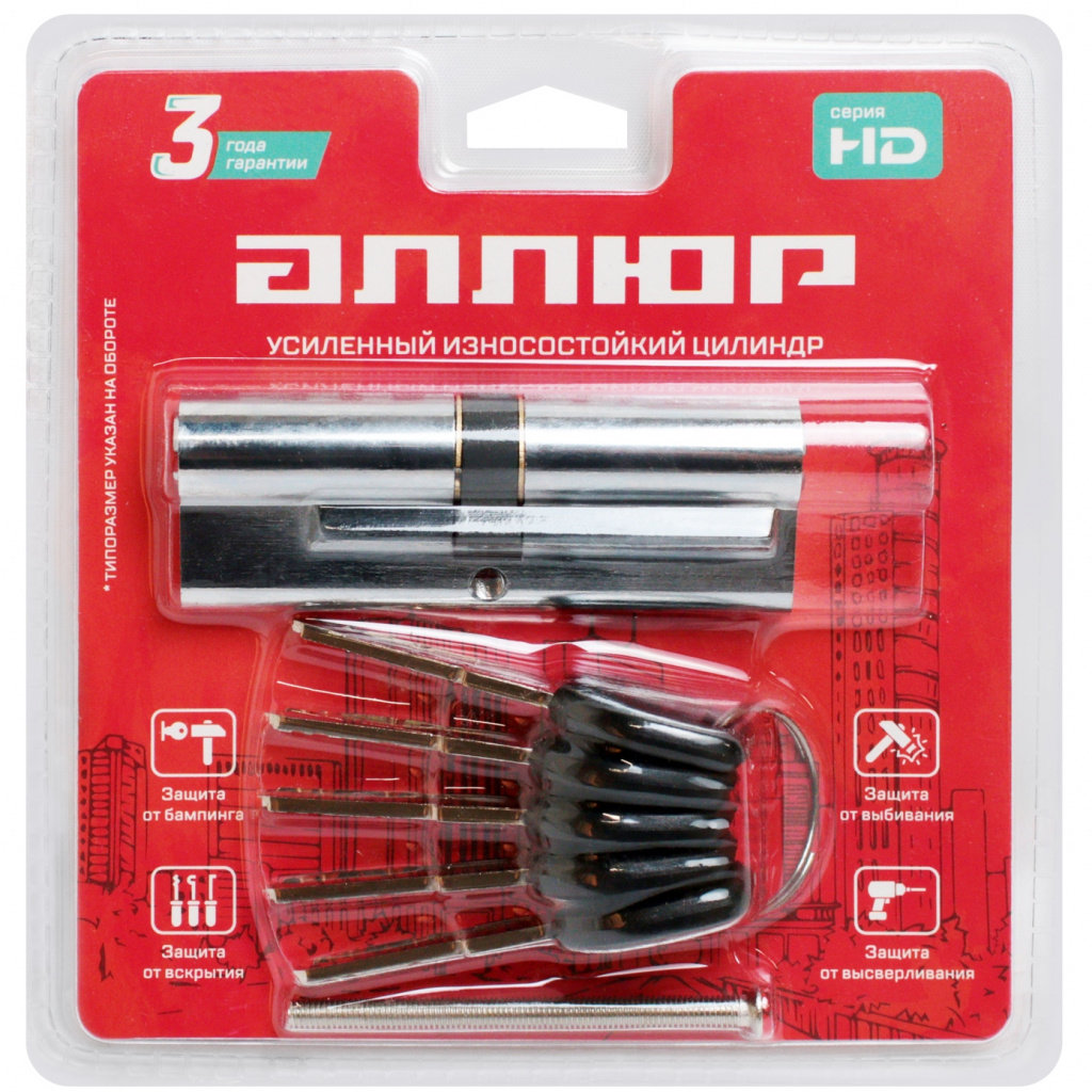Механизм защищен от высверливания, вскрытия бампингом и отмычками. Выступающий на 30 градусов из плоскости механизма кулачок защищает цилиндр от выбивания из двери.