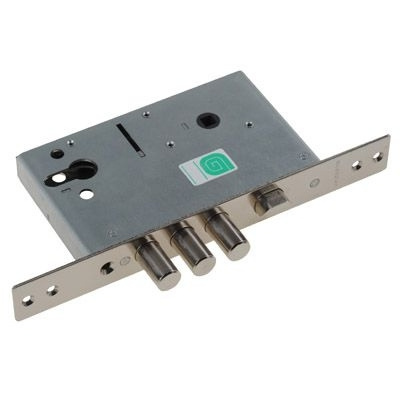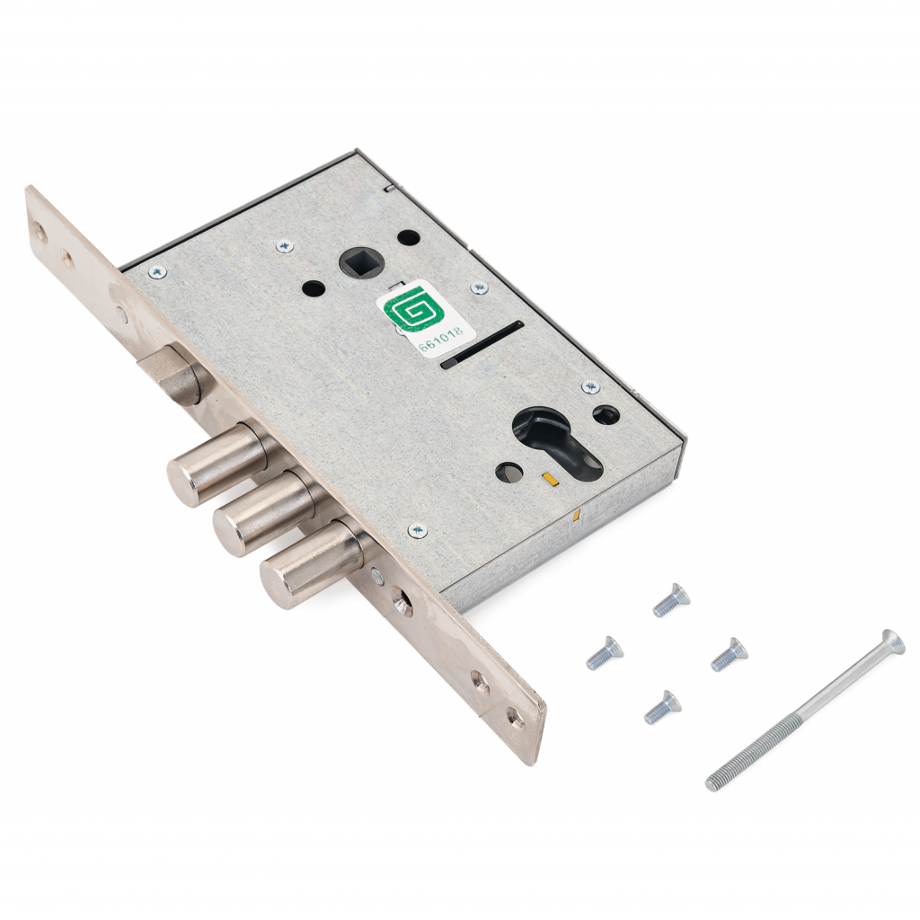 Замок имеет засов из трех цилиндрических ригелей из стали диаметром 15,8 мм, с максимальным вылетом 26 мм, и защелку диаметром 19,8 мм.