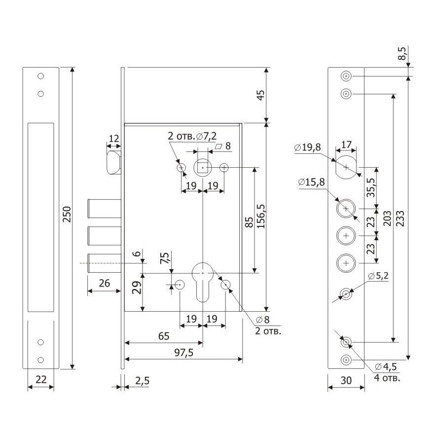Габариты замка - 155х97,5х22 мм