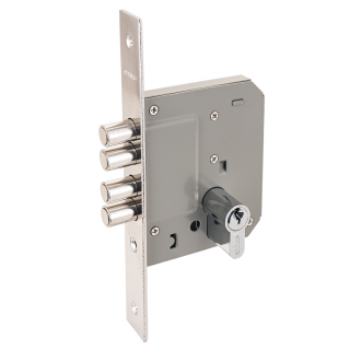 Замок имеет засов из трех цилиндрических ригелей диаметром 15,8 мм, с максимальным вылетом 26 мм, и защелку диаметром 19,8 мм