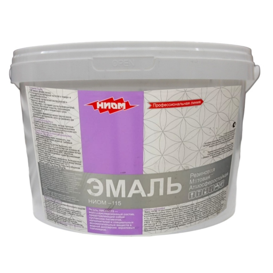 Эмаль НИОМ-115 Эластичная, Матовая, атмосферостойкая предназначена для создания высококачественных декоративно-защитных покрытий на поверхностях эксплуатируемых внутри и снаружи помещений, при окраске стен и потолков внутри помещений с умеренной и повышенной влажностью; ванные комнаты, санузлы, прачечные кухни и т.д., устойчива к образованию конденсата и воздействию пара. Правильно сформированное покрытие допускает многократную безабразивную мойку с применением синтетических моющих средств, без изменений декоративных свойств поверхности.