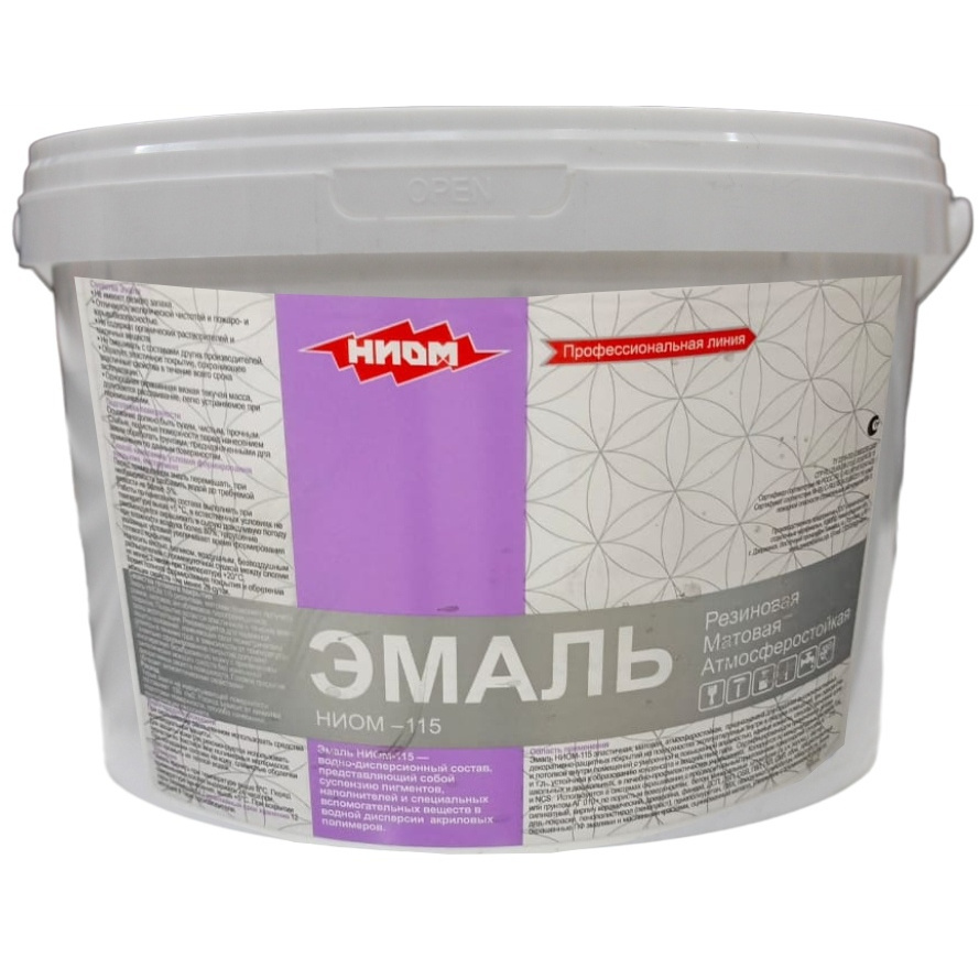 Эмаль НИОМ-115 Эластичная, Матовая, атмосферостойкая предназначена для создания высококачественных декоративно-защитных покрытий на поверхностях эксплуатируемых внутри и снаружи помещений, при окраске стен и потолков внутри помещений с умеренной и повышенной влажностью; ванные комнаты, санузлы, прачечные кухни и т.д., устойчива к образованию конденсата и воздействию пара. Правильно сформированное покрытие допускает многократную безабразивную мойку с применением синтетических моющих средств, без изменений декоративных свойств поверхности.